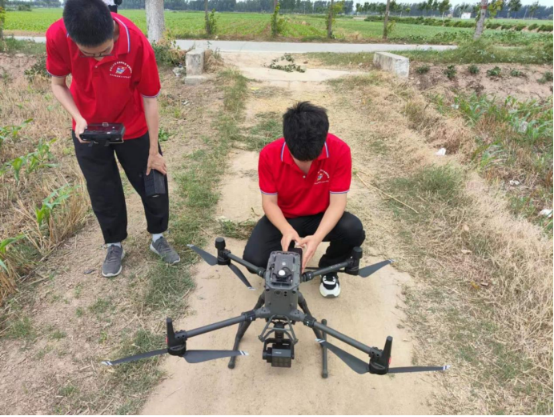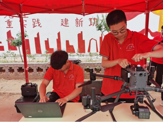 实践队员们做好准备工作之后,与村民交流将无人机等科技引入农业生产带来的农业变革,实践队员们试飞无人机,为前去农田进行拍照做准备。