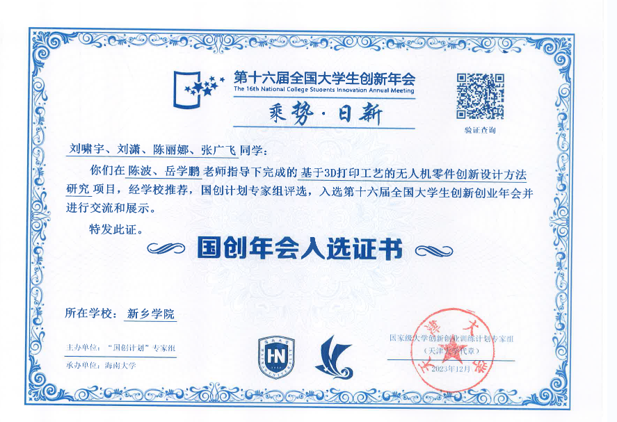 太阳成集团tyc122cc2021级机械设计制造及其自动化专业刘啸宇同学主持,刘潇、陈丽娜等同学参与的国家级大创项目《基于3D打印工艺的无人机结构创新设计方法研究》获河南省教育厅推荐参加了本次年会成果展示。