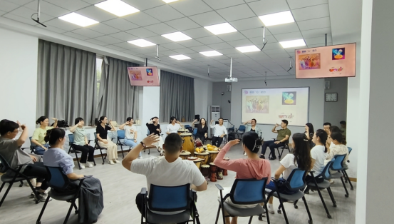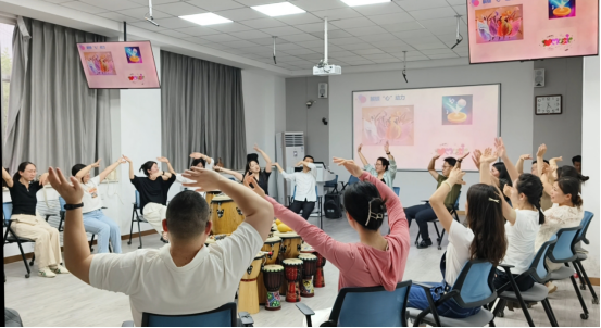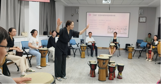 活动中,张玲通过“破冰”“舞动疗愈”“戏剧游戏”“音乐语言指令游戏”,带领大家从迷茫、困惑、烦躁等情绪中逐步转变为信任、沉浸、放松、享受,以思维和身体来感受艺术带来的心理疗愈,既专业又专心,既神秘又生动,既温暖又温柔,既有意义又有趣。最后通过“鼓圈”游戏调动大家将肌肉与音乐进行联动,用歌唱、舞动和运动这些表达性艺术方式润泽心灵。整个互动,异彩纷呈,老师们在这一新鲜形式的互动活动中,兴趣盎然,收获满满。