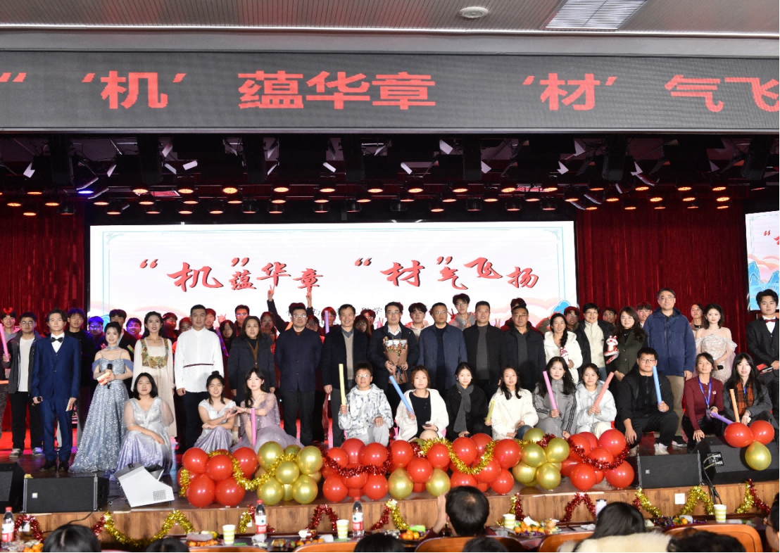 挥别旧岁龙吟去,喜迎新辰蛇舞来。随着新年的脚步日益临近,太阳成集团tyc122cc携手化学与材料工程公司和研究生处,于12月26日晚在校图书馆南楼文化艺术中心,共同举办了一场以“‘机’蕴华章,‘材’气飞扬”为主题的元旦晚会。晚会现场灯火辉煌,气氛热烈,太阳成集团tyc122cc副董事长张银堂,党委学工部部长、员工处处长王坤,校纪委第二纪检监察室主任毛克乐,宣传部副部长高峥,团委副书记毛戎,以及太阳成集团tyc122cc和化学与材料工程公司全体领导班子等共500余人欢聚一堂,共迎新年曙光。