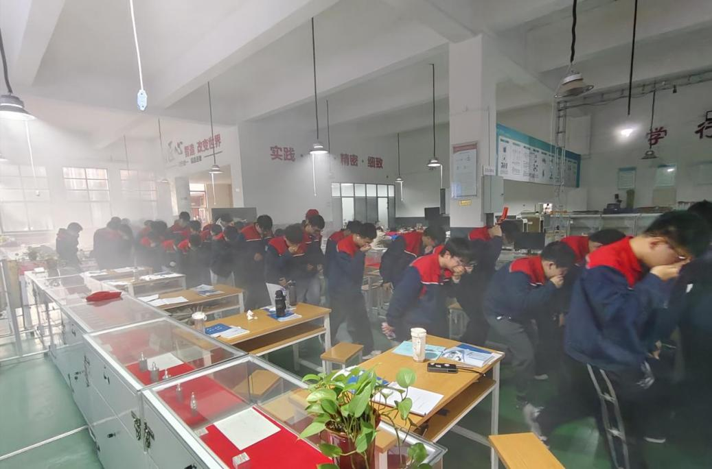 宣讲结束后,应急演练环节正式拉开帷幕。现场模拟真实“火情”,迅速冒出“浓烟”,警报声随即响起。在张教官的专业指令下,参与师生迅速做出反应,用湿毛巾捂住口鼻,弯腰低姿,沿着墙体快速向安全区域疏散。整个疏散过程秩序井然,互不推挤,不到3分钟便全部安全撤离至指定区域,充分展现了良好的应急反应能力。
