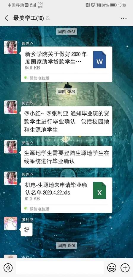 “伟大出自平凡,英雄来自人民。”疫情尚未结束,他们的工作也从未松懈,认真落实好毕业班贷款员工的毕业确认工作,充分运用了现有的网络平台进行直播教学,在超星学习通章节中上传自己录制的教学视频,使用中国慕课等网络精品课程资源作为教学资料等多种方式,给员工创造丰富多彩、高效高质的课堂。他们通过语音、打电话了解同学们的健康状况和出行状态,提醒同学们认真填写“今日校园”个人健康日报信息,做好心理疏导,建立每个员工的台账。他们叮嘱同学们做好个人防护,提醒员工不信谣不传谣、减少病毒传播机会、提高防护意识,以自己的实际行动积极遏制疫情扩散。