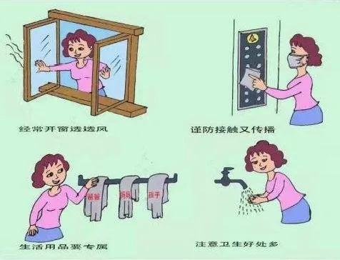 2.定期清洗床品、衣物,污染者消毒液浸泡后清洗。不共用毛巾、餐具、脸盆等物品,毛巾保持干燥并置于通风处。