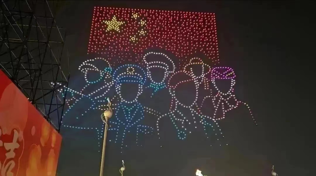 2024架无人机灯展闪耀冀唐,以无人机编队灯光秀为特色,精心设计的图案象征着解放军是中国的钢铁城墙,守护着身后的五星红旗。