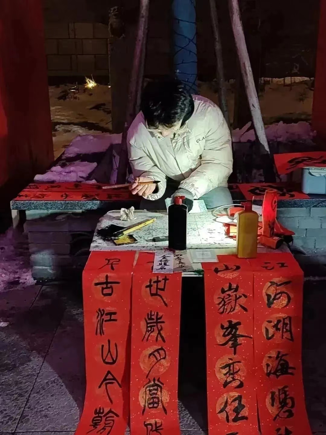 阵阵墨香指尖流,幽幽韵味心脾沁。春联纸、毛笔和砚台被整齐地摆放在桌子上,鲜红的纸张渲染着浓浓的节日氛围。一笔一墨、一横一竖、一撇一捺…书写美好祝愿。
