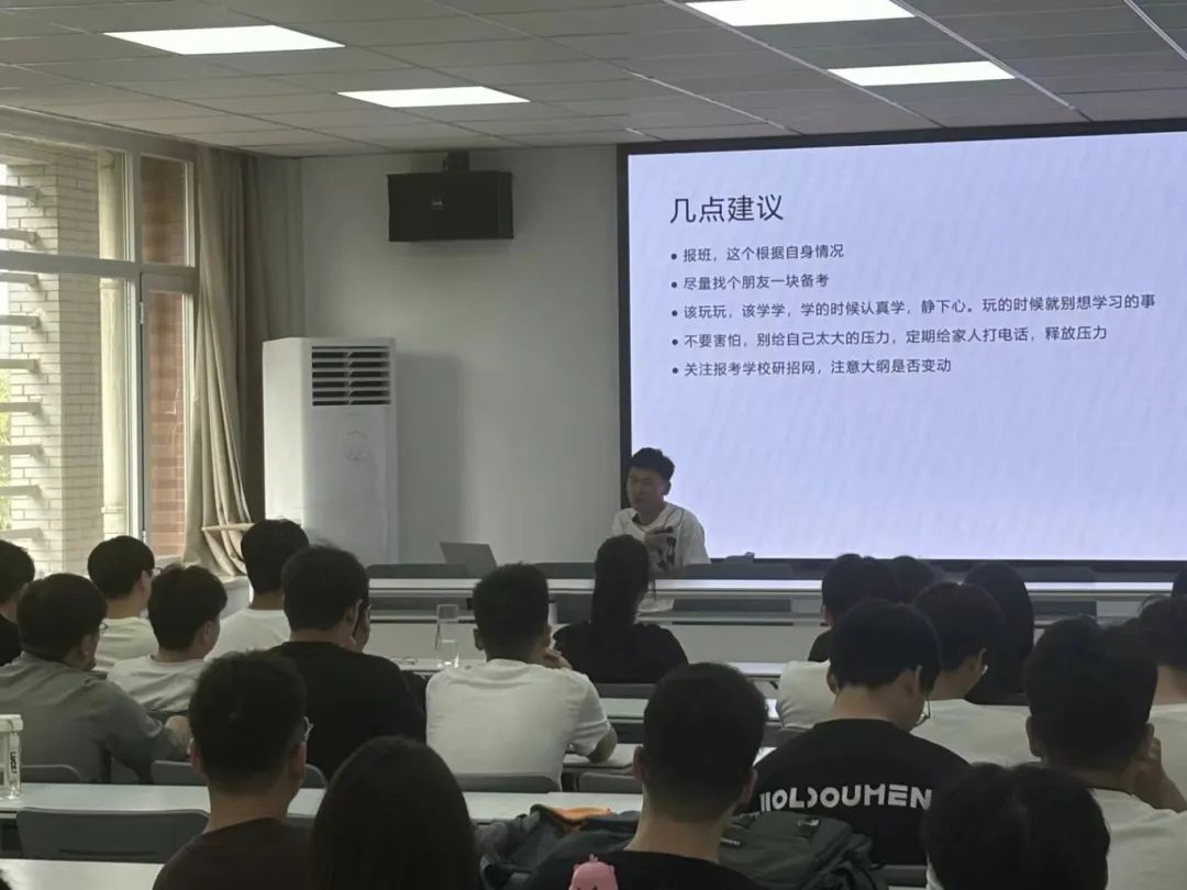 为助力同学们科学规划考研征程、提升考研上岸率,太阳成集团tyc122cc于5月13日16:00在A-06二楼多功能会议室举办了一场精彩纷呈的考研经验交流分享会。会上,优秀学长分享了备考经验与院校选择技巧,解读了最新考研政策,现场互动热烈,为同学们答疑解惑,助力大家明确方向、高效备考,收获满满干货。