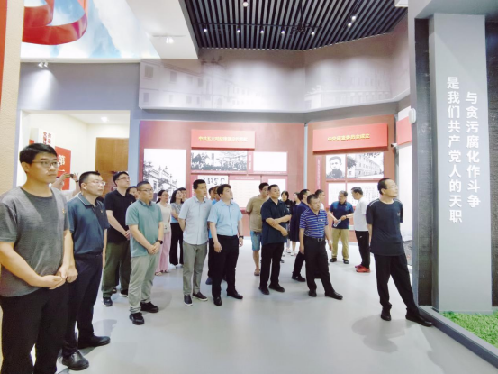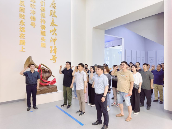在尾厅,设置的“冲锋号”艺术造型及雕刻字,提醒着我们大家要时刻保持清醒头脑,永远吹冲锋号,牢记反腐败斗争永远在路上。在入党誓词宣誓区,张烨作为领誓人,带领大家重温入党誓词,不忘入党初心。最后,大家怀着敬畏之心在馆内合影。