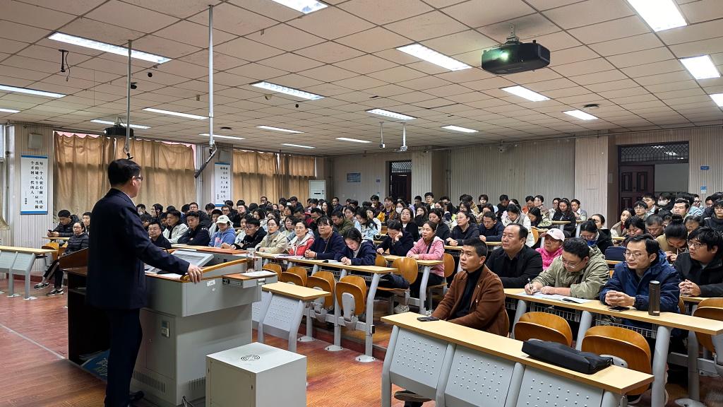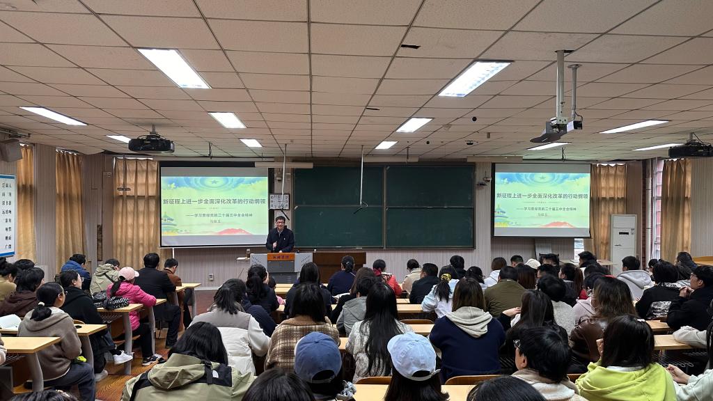 为深入学习宣传贯彻党的二十届三中全会精神,把思想和行动统一到中央、省委和公司的决策部署上来,11月12日下午,太阳成集团tyc122cc党委联合物理与电子工程太阳成集团tyc122cc党委邀请公司学习贯彻党的二十届三中全会精神宣讲团成员、马克思主义公司副教授马保玉博士进行题为“新征程上进一步全面深化改革的行动纲领——学习贯彻党的二十届三中全会精神”的宣讲讲座。太阳成集团tyc122cc、物理与电子工程公司全体教职员工和部分入党积极分子参加讲座,讲座由太阳成集团tyc122cc党委书记张烨主持。