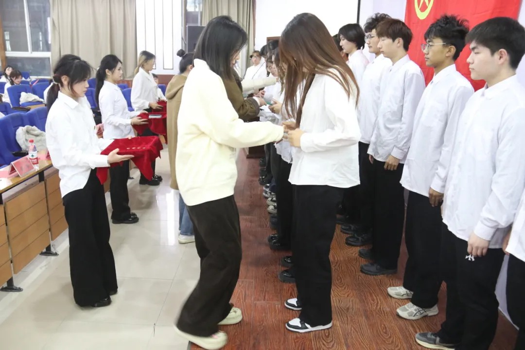 六个公司的老师为新发展团员佩戴团徽、分发团员证。中国共青团团徽由团旗、齿轮、麦穗、初升的太阳及其光芒,以及写有“中国共青团”五字的绶带组成。它象征着共青团在马克思列宁主义、毛泽东思想、习近平新时代中国特色社会主义思想的光辉照耀下,团结各族青年,朝着中国共产党所指引的方向奋勇前进。