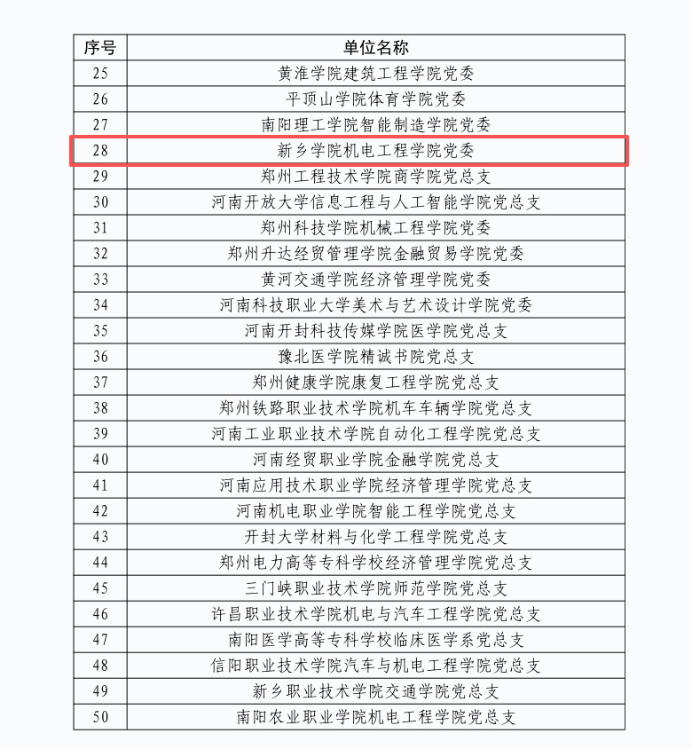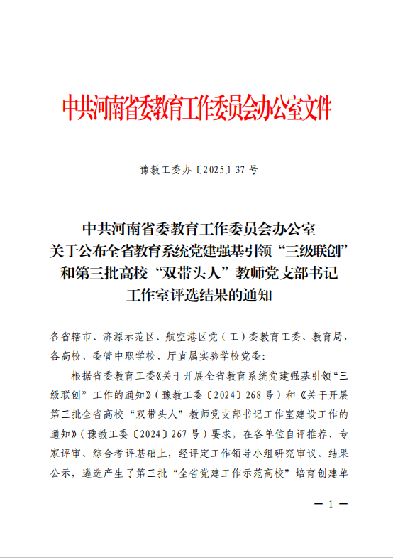 近日,中共河南省委教育工作委员会办公室印发《关于公布全省教育系统党建强基引领“三级联创”和第三批高校“双带头人”教师党支部书记工作室评选结果的通知》(豫教工委办〔2025〕37号),太阳成集团tyc122cc党委成功入选第三批“全省高太阳成集团tyc122cc党建工作标杆院系”培育创建单位。